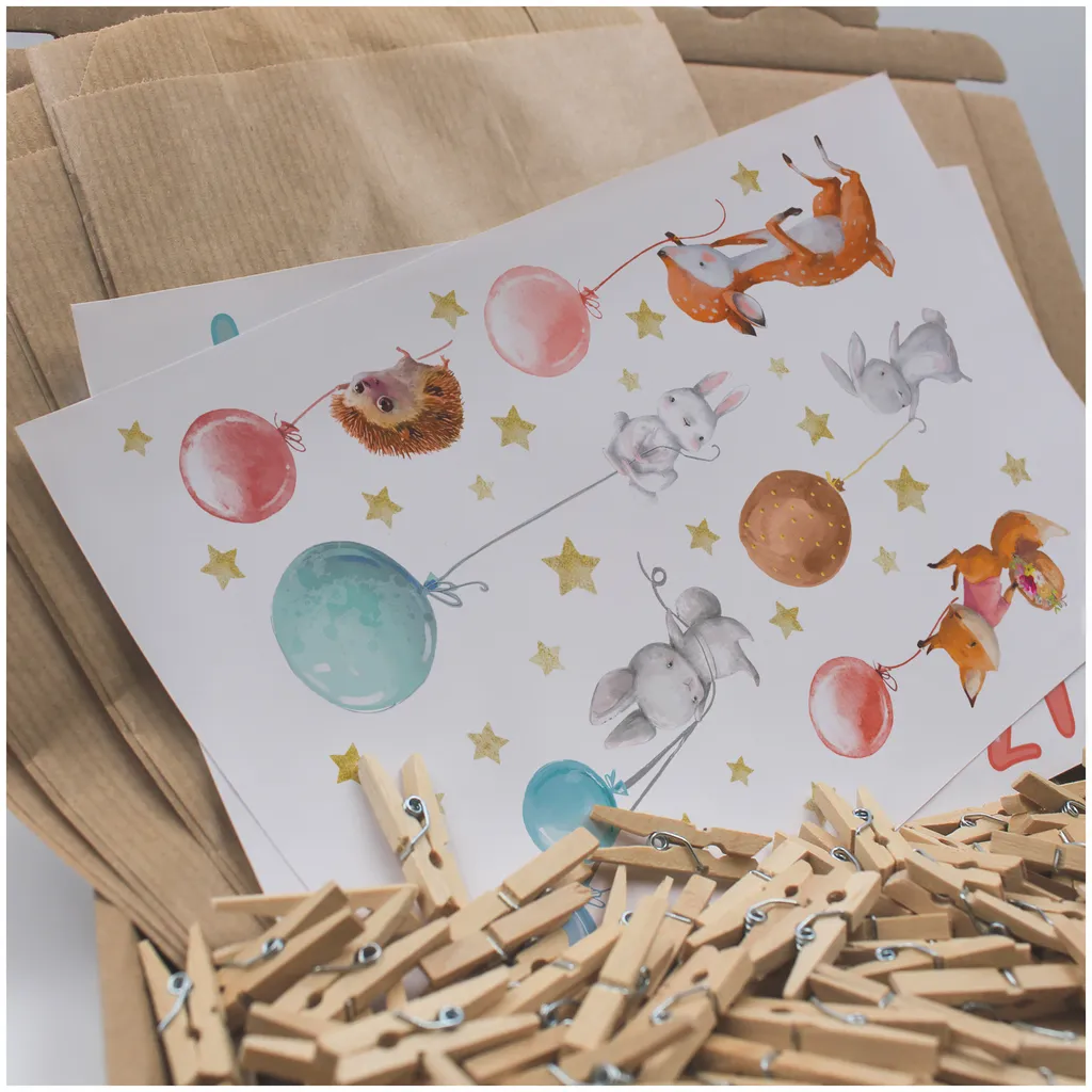 – 24 Zahlen zum Aufkleben, 24 braune Papiertüten und 24 Holzklammern