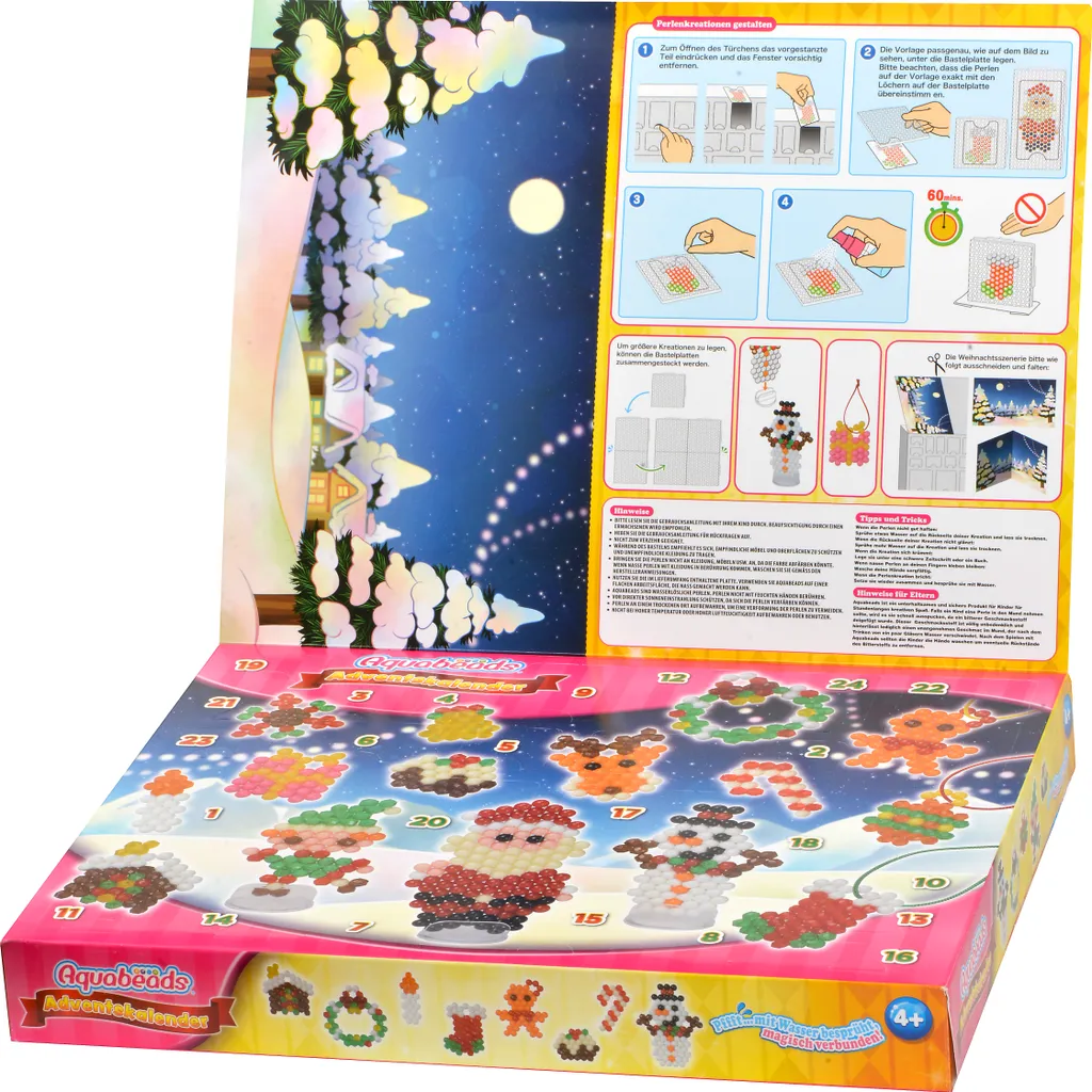​Ähnlich wie mit Bügelperlen lassen sich die Aquabeads-Bastelperlen magisch verbinden, hierfür genügt bereits das besprühen mit Wasser. Daher können Kinder hiermit ganz alleine ihren kreativen Geist austoben. Hinter den Türchen verbergen sich 24 Überraschungen, mit denen kleine Bastler 15 weihnachtliche Kreationen anfertigen können. Mit Bastelplatte, Sprüher, Kordeln und Ständer ist in diesem Adventskalender alles enthalten was für den Einstieg ins Basteln mit Aquabeads benötigt wird.
