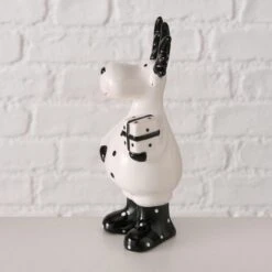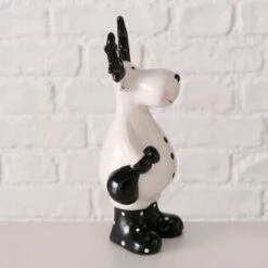- Beide Deko-Aufsteller haben ein niedliches Gesicht mit schwarzem Geweih. Der eine trägt ein Geschenk bei sich, während der andere einen Sack in der Hand hält. Die beiden Hirsche tragen zudem noch putzige schwarze Stiefel mit weißen Pünktchen.