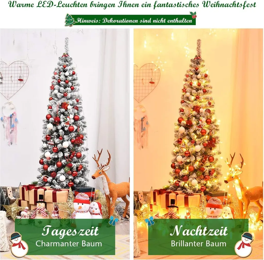 Verwandeln Sie Ihr Wohnzimmer in ein tolles Winterwunderland mit unserem beleuchteten, schneebedeckten Bleistift-Weihnachtsbaum. Der Baum, der mit 500 Zweigen und schneebedeckten Nadelnausgestattet ist, ist dicht und elegant. Er sieht fast wie ein echter Baum aus. 250 warme LED-Lichter sorgen für eine festliche Beleuchtung in Ihrem Zimmer. Gestützt von einem stabilen Metallständer wird dieser künstliche Weihnachtsbaum auch in den kommenden Jahren aufrecht stehen. Gleichzeitig ist der Ständer faltbar, um die Lagerung zu erleichtern. Dank der klappbaren Konstruktion lässt sich der künstliche Baum leicht aufstellen und aufschütteln. Mit seinem schlanken Bleistiftdesign und seinem realistischen Aussehen ist dieser künstliche Weihnachtsbaum perfekt für das Aufstellen in Ecken oder kleinen Räumen. Feiern Sie Weihnachten stilvoll mit unserem schneebedeckten Bleistift-Weihnachtsbaum!