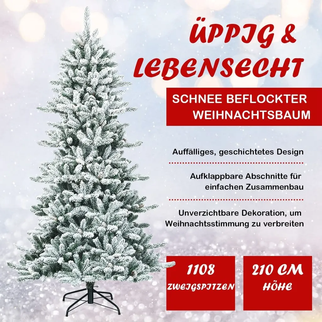Brauchen Sie einen neuen Weihnachtsbaum für die kommende Weihnachtszeit? Suchen Sie nicht weiter! Der schneebedeckte Weihnachtsbaum ist eine perfekte Dekoration, um ein Winterwunderland in den eigenen vier Wänden zu erschaffen und Sie in Weihnachtsstimmung zu versetzen. Sorgfältig aus zu 100% neuem PVC gefertigt ist er Bäumen aus recyceltem Material überlegen. Sie werden keinen Geruch wahrnehmen, der durch minderwertiges Material und eine schlechte Verarbeitung entsteht. Dank der praktischen Scharnierstruktur ist er in wenigen Minuten supereinfach aufzubauen. Lagern Sie die Teile und den klappbaren, stabilen Sockel ein, wenn die Weihnachtszeit vorbei ist, und verwenden Sie sie im nächsten Jahr wieder. Der 210 cm große Weihnachtsbaum mit üppigem Aussehen und 1108 Zweigenwird Sie durch das Fest begleiten.