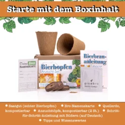 - Züchte den Hopfen mit Hilfe der Anleitung & Zubehör → danach kannst du an Hand der Bierbrau- Anleitung dein eigenes Bier brauen