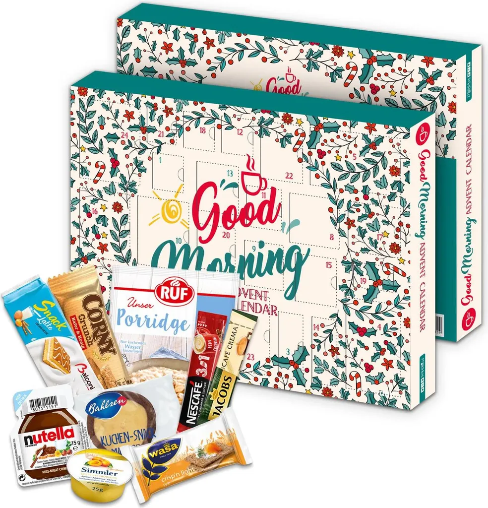 gefüllt mit Frühstücks- und Genussartikeln wie Honig, Marmelade, Nutella, Marmorkuchen, Porridge, Brot, Tee und Kaffee.