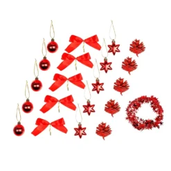 Der Topf ist aus einem Jutestoff . Der langlebige Christbaumschmuck (glänzende rote Kugeln bruchsicher , roteTannenzapfen Aufhänger , rote Deko Sternen Girlande , rote Weihnachtsschleifen ) ist beiliegend. Somit kann der Weihnachtsbaum individuell dekoriert und gestaltet werden.