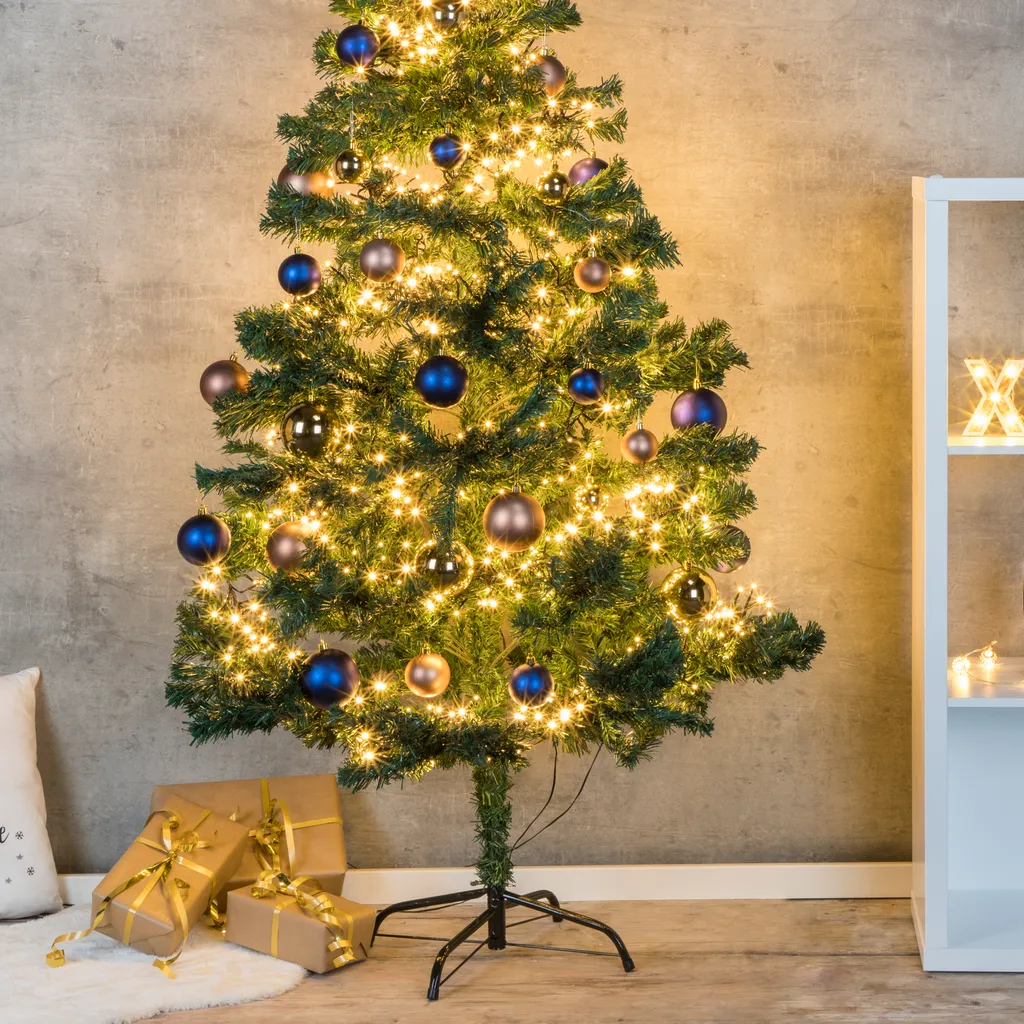 Die Äste des künstlichen Tannenbaus bestehen stabilem Metalldraht mit ‚Tannennadeln‘ aus Kunststoff. Ein robuster Ständer aus Metall sorgt dafür, dass der Baum nicht so leicht umkippt. Der Zusammenbau des Weihnachtsbaums ist dank eines Stecksystems kinderleicht.
