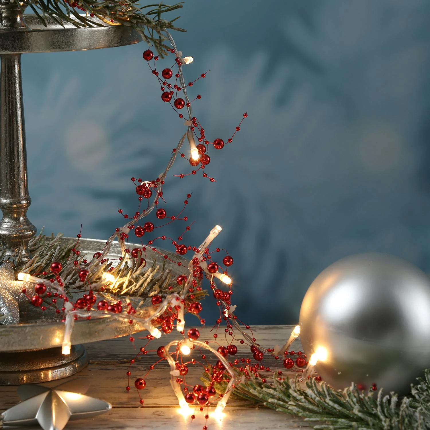 Diese tolle LED Lichterkette mit 20 warmweißen LED ist die perfekte Dekoration für die Weihnachtszeit. Die roten großen und kleinen Perlen sehen einfach klasse aus.