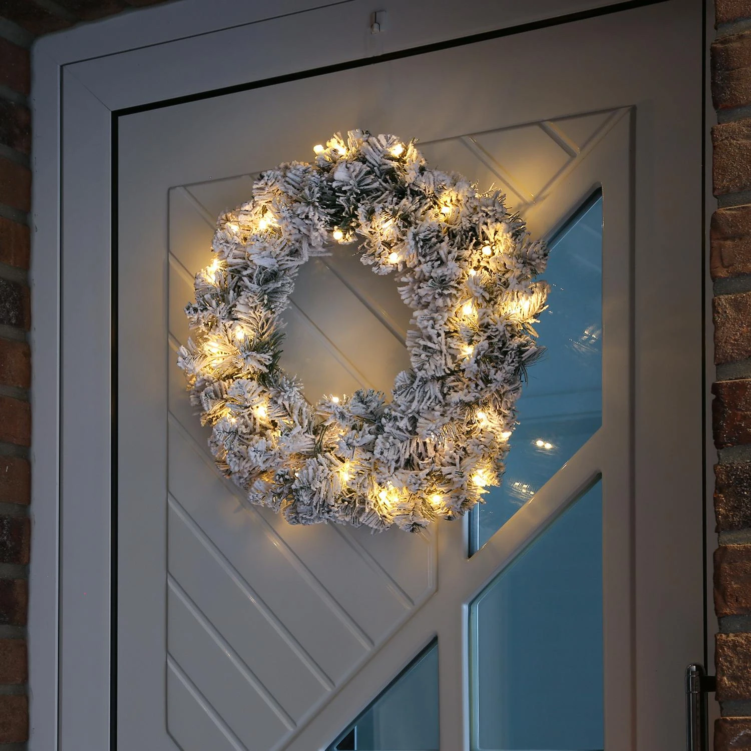 Dieser wunderschöne grüne Tannenkranz in Schneeoptik und den warmweißen LED zaubert eine weihnachtliche Stimmung in Dein Zuhause. Weil der Kranz mit einem Durchmesser von 50cm an der Unterseite abgeflacht ist, kannst Du diesen vielseitig einsetzen.