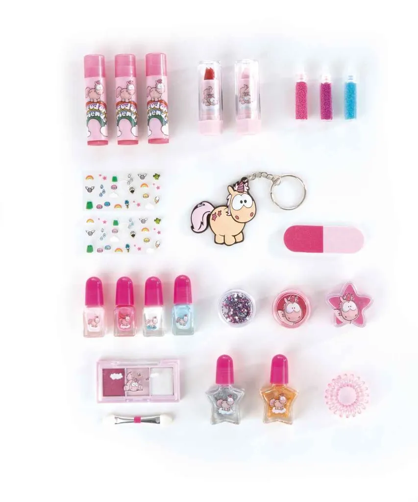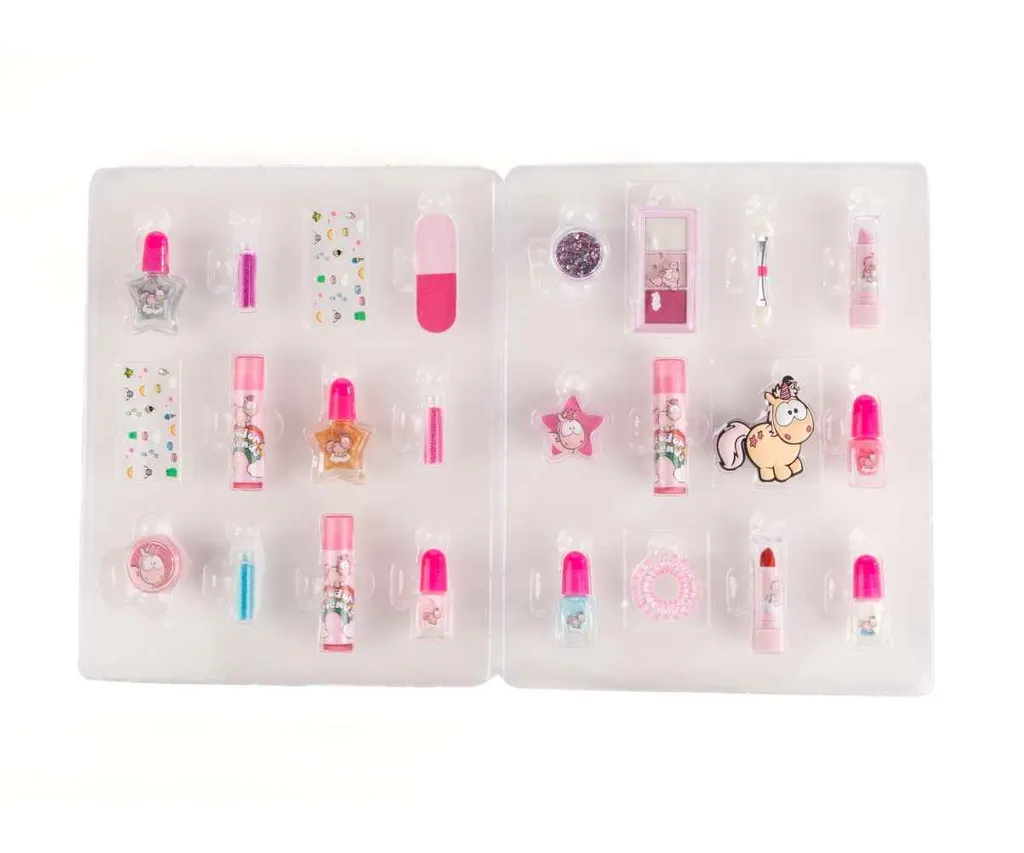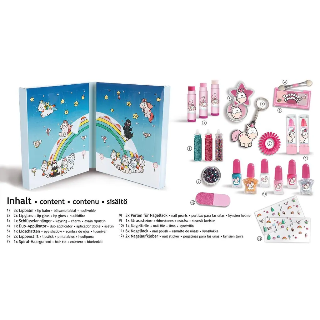 Kosmetik- und Schmuckartikel warten hinter den 24 TĂĽrchen des Einhorn Theodors Adventskalender Winterzauber