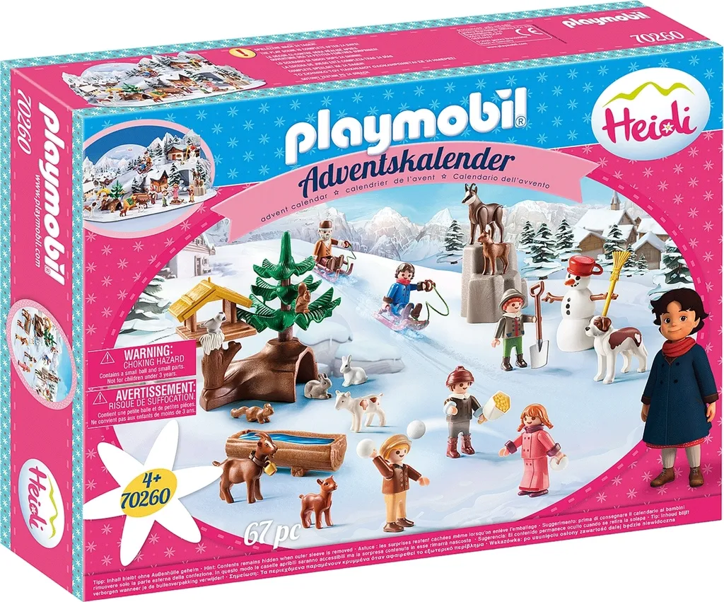 - Contenido: 1 PLAYMOBIL Calendario de Adviento El Mundo de Invierno de Heidi, 68 piezas con instrucciones: 1 calendario de adviento, 4 figuras, 1 escenario, 62 accesorios, Material: Papel, Plástico, Caja de LxPxA: 40x30x7.5 cm, 70260