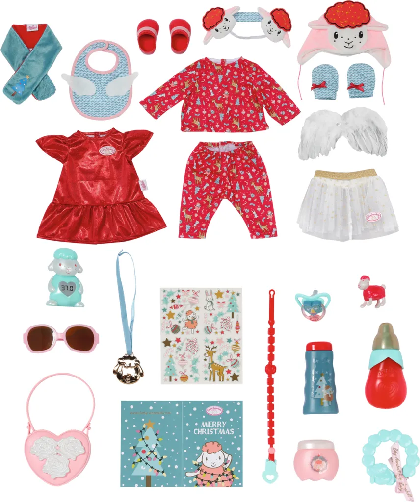 Baby Annabells Adventskalender enthält KleidungsstĂĽcke und Accessoires in klassischen Rot- und GrĂĽntönen. Die Wartezeit bis zum Heiligabend verbringt die Kleine entspannt im 2-teiligen Anzug mit Rentier-, Zuckerstangen- und Weihnachtsbaum-Motiven. Dabei nuckelt sie aufgeregt am Schnuller oder kaut auf dem BeiĂźring herum. NatĂĽrlich geht’s während der Adventszeit auch mal an die frische Luft. Mit MĂĽtze, Ohrenwärmern, Handschuhen und Sonnenbrille ist Baby Annabell bestens fĂĽr den Wei hnachtsmarkt gerĂĽstet. Zum Plätzchen essen wird der Latz mit FlĂĽgelchen umgelegt und Milch aus dem Fläschchen getrunken. Das schicke Festtagsoutfit besteht dann aus dem roten Glitzerkleid, dem samtigen Schal, dem TĂĽll-Röckchen mit goldenen Sternchen, der rosigen Herz-Tasche, den Schuhen mit Krönchen-Abschluss und natĂĽrlich den FlĂĽgelchen. Original Kleidung und Accessoires fĂĽr die Baby Annabell Markenspielpuppe. Das hochwertige Zubehör fördert die Fantasie und bringt neue Spielanregungen und -möglichkeiten. Baby Annabell Adventskalender aus 24 Ăśberraschungen, bestehend aus KleidungsstĂĽcken und Accessoires fĂĽr Baby Annabell.