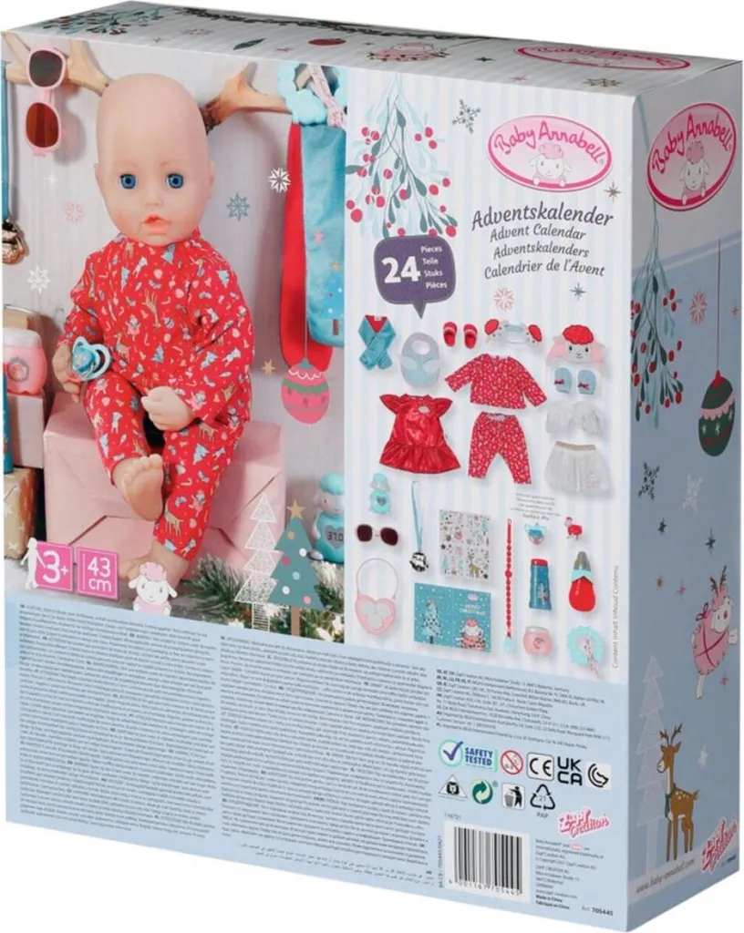 Adventskalender mit 24 Fenstern, in jedem Fenster ist eine Ăśberraschung. – Kleidung und Accessoires fĂĽr Baby Annabell Puppen Größe 43 cm, alles farblich aufeinander abgestimmt. – Die Schachtel hat eine schöne Form und Fenster auf beiden Seiten fĂĽr mehr Freude beim Finden des Richtigen Anzahl.- Spielzubehör fĂĽr Kinder ab 3 Jahren.-FĂĽr Puppengröße 43 cm.-Handwäsche in lauwarmem Wasser möglich. Nicht im Trockner trocknen.-Verpackung: plastikfreie Verpackung – Karton mit 24 Sichtfenstern.