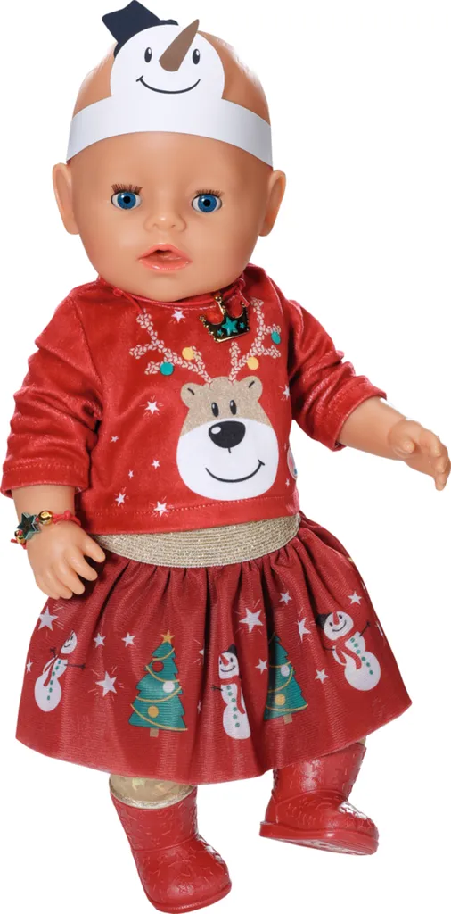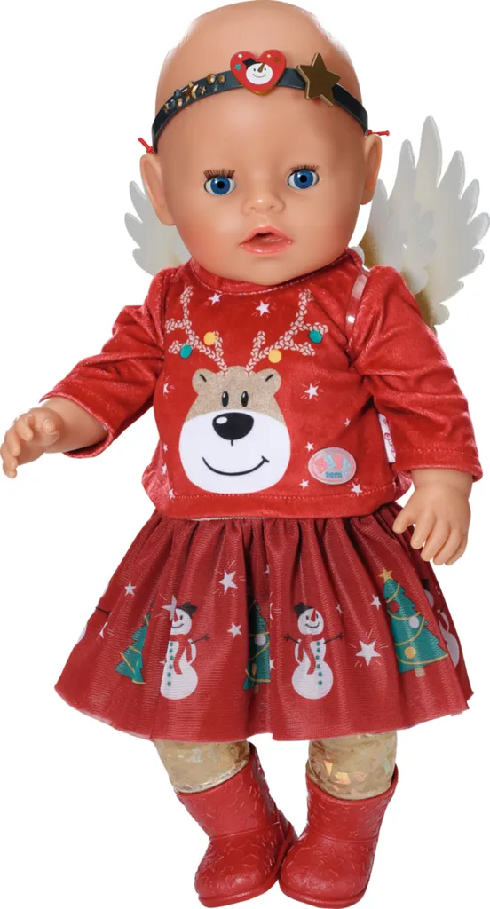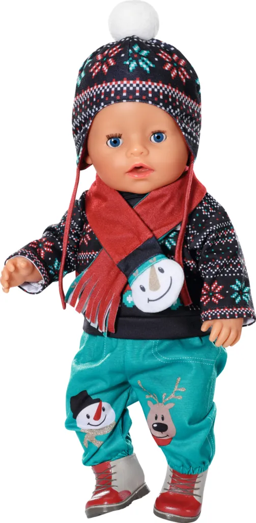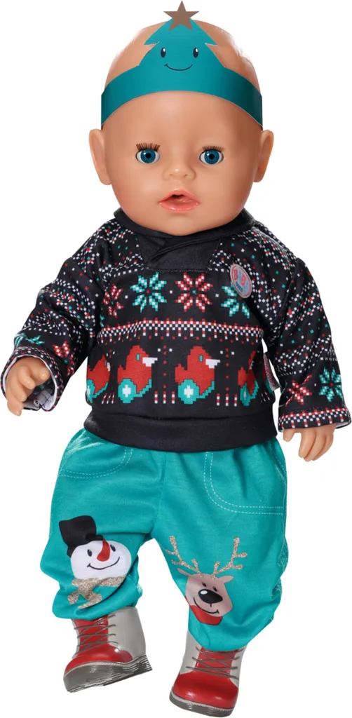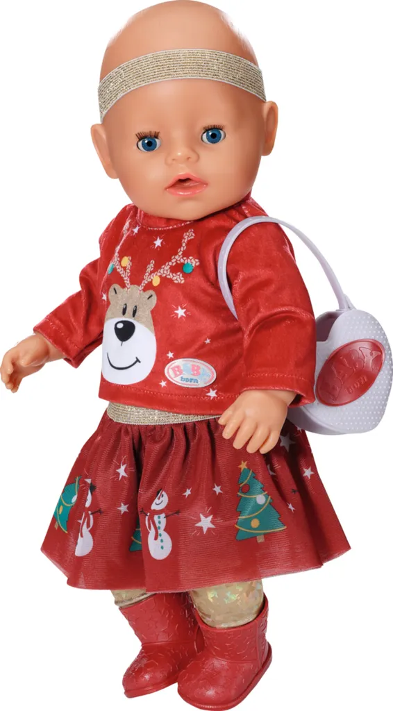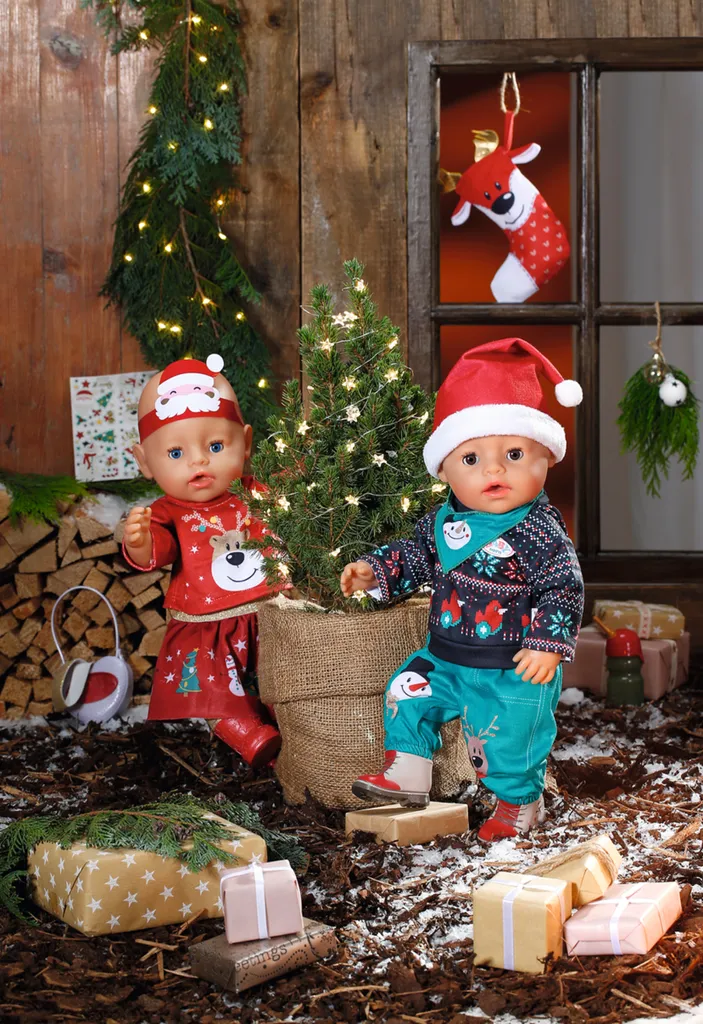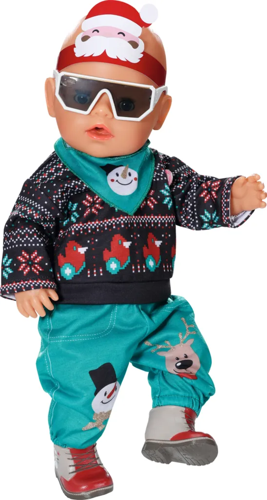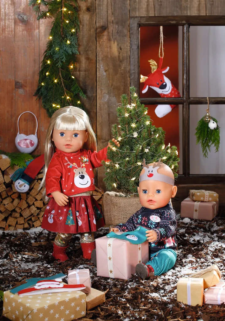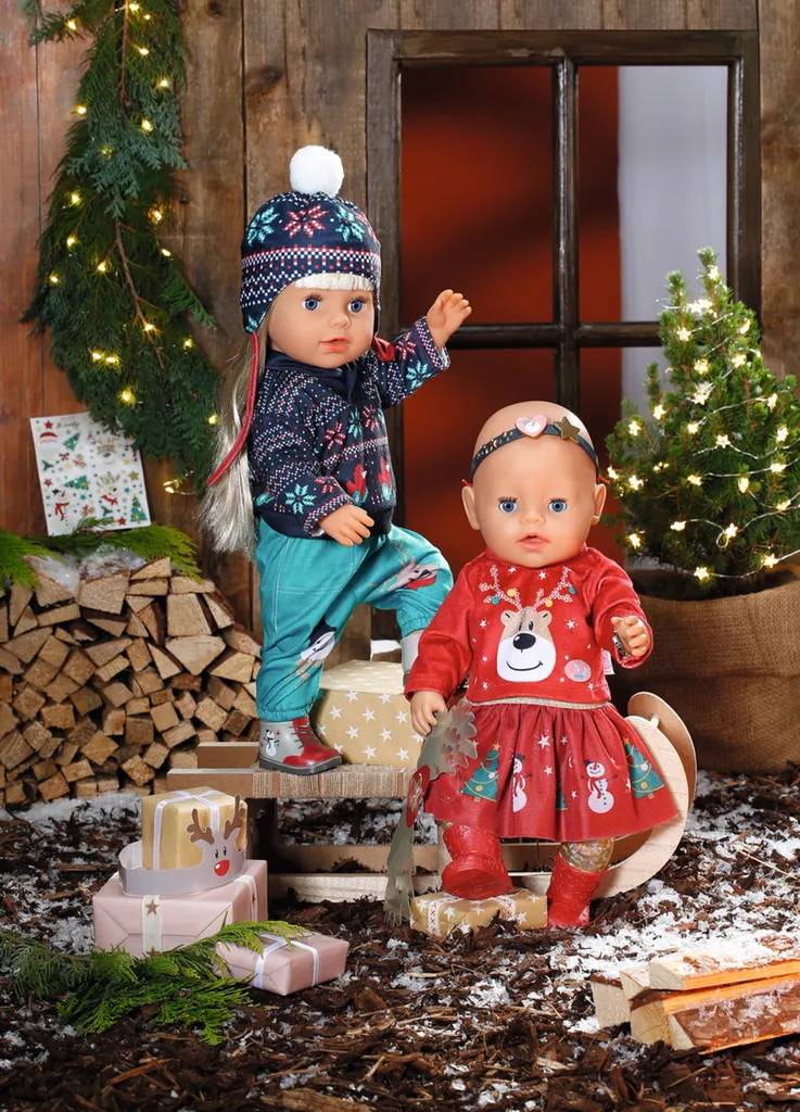 Natürlich trägt BABY born auch ihre Outfits mit Weihnachtsmotiven. Sie hat zwei kuschelige Pullis, eine Hose, goldene Leggings, einen Rock und eine herzige Tasche. Für draußen gibts noch ein Halstuch, einen Schal, eine Mütze und eine stylische Sonnenbrille. Neben weiteren verspielten Accessoires darf eine Nikolausmütze im Adventskalender natürlich nicht fehlen.